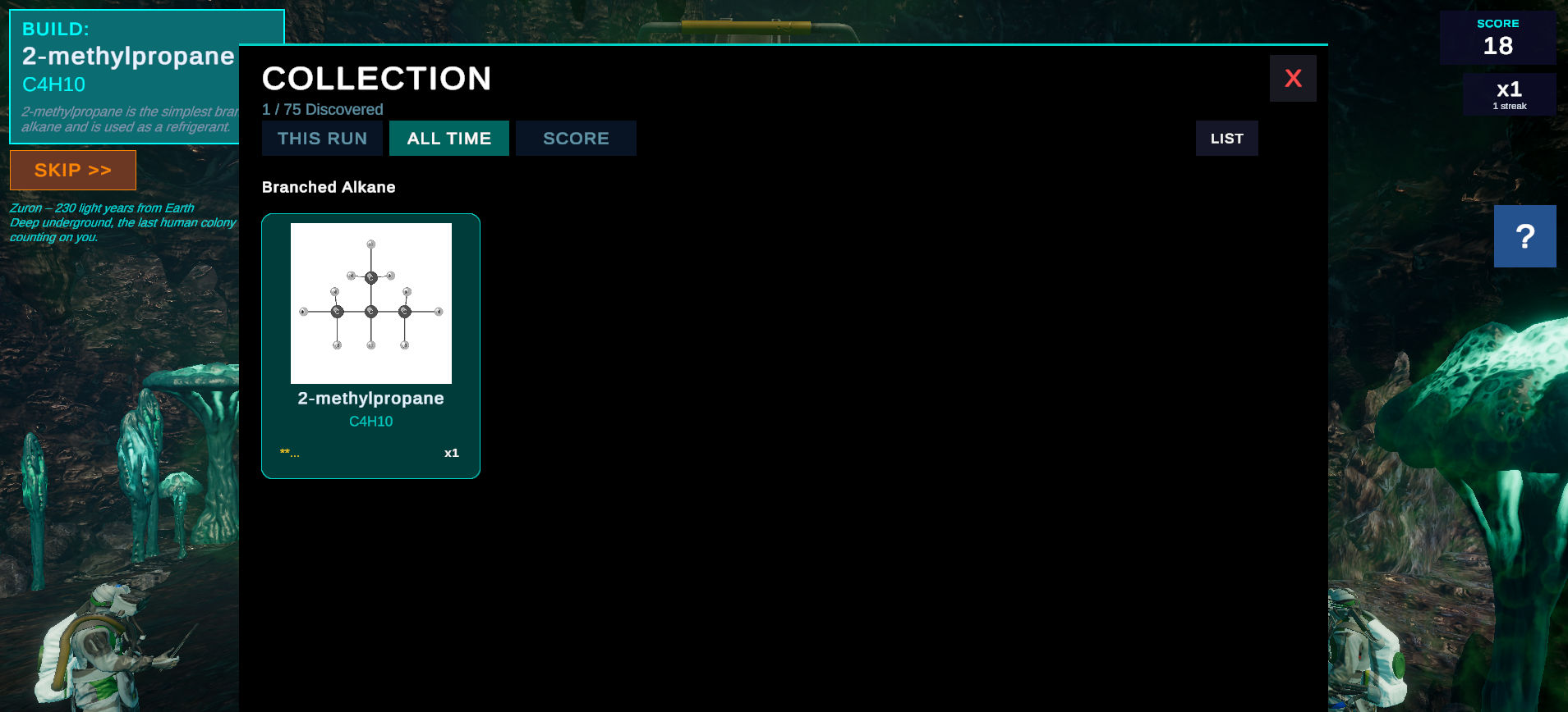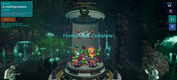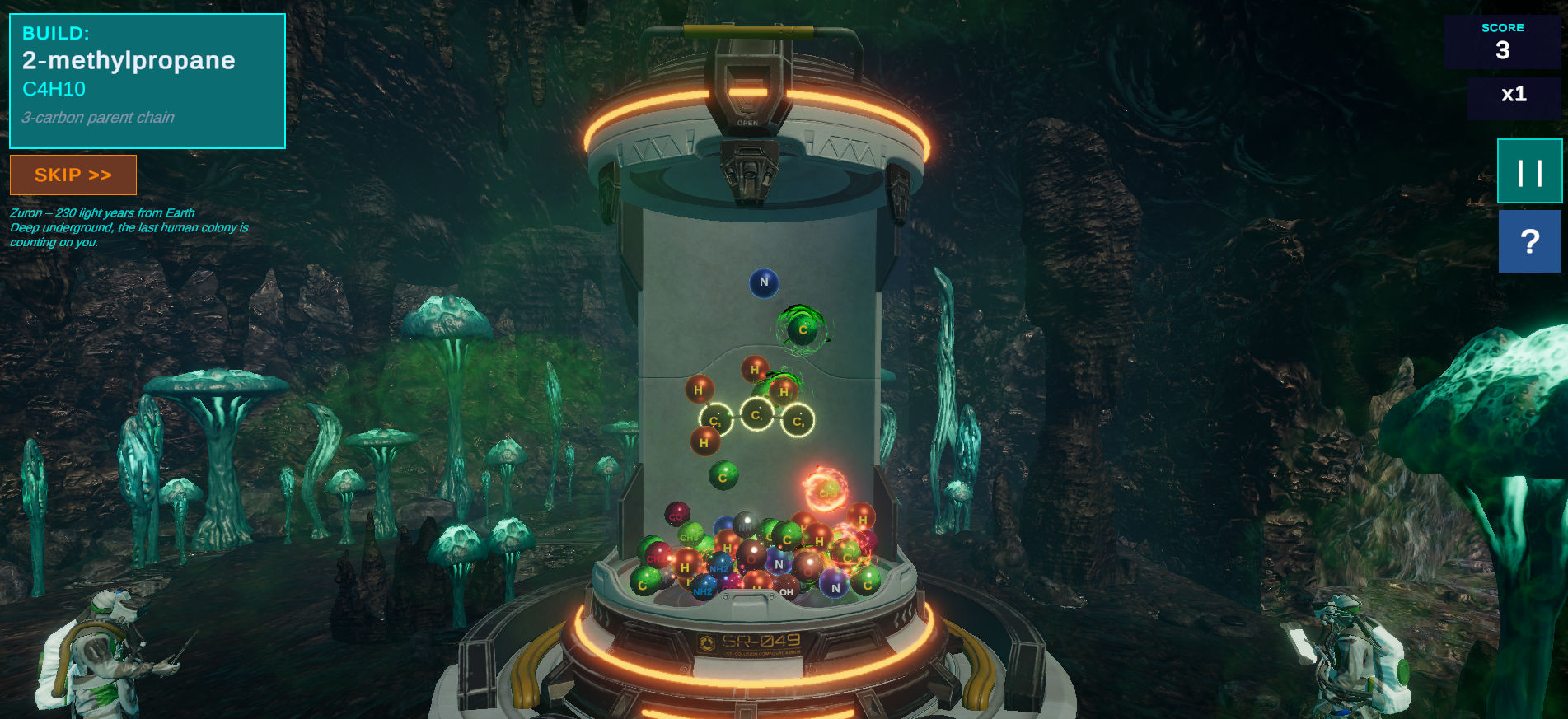 That's where you come in. As a colony scientist, you formulate the building blocks of life — one molecule at a time. Atoms and functional groups drop into your sci-fi capsule. Drag and snap them together to construct the target compound, from simple methane all the way to complex esters, amides, and anhydrides. Everything follows real chemistry: proper valencies, bond angles, and IUPAC naming.
